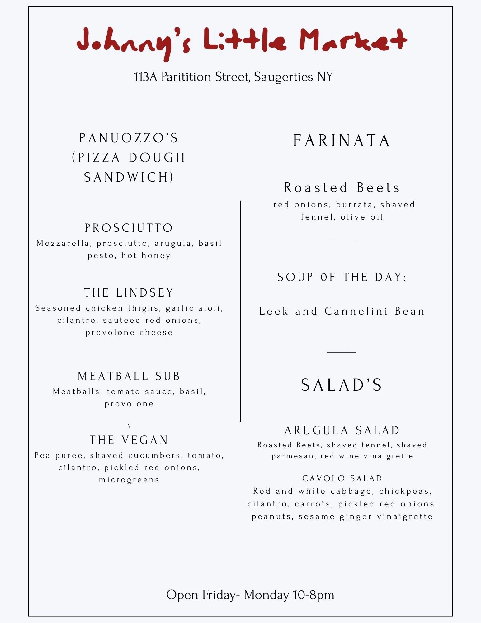 Come check out Johnnys Little Market at 113a Partition Street, Saugerties NY 120477 (behind Ohana, in the municipal lot).